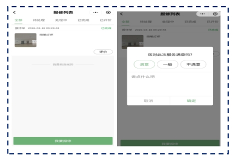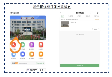 首页点击“我要报修” → 选择对应工单,可实时查看所报的“待处理→处理中→已完成”状态。